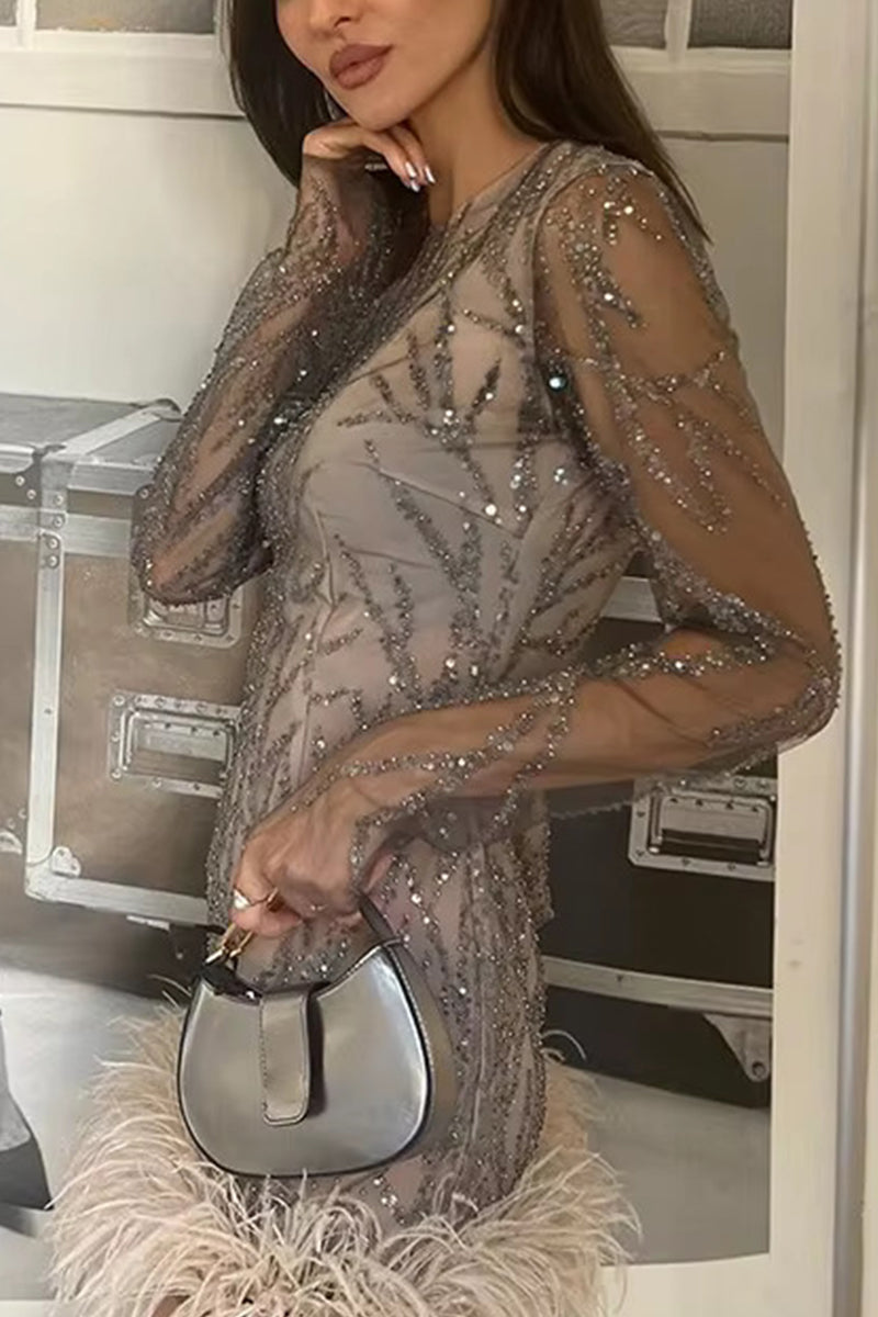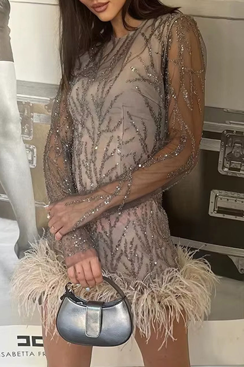 Elvira® | Elegant mini dresses with O-neck and tinsel feather hem in mesh fabric