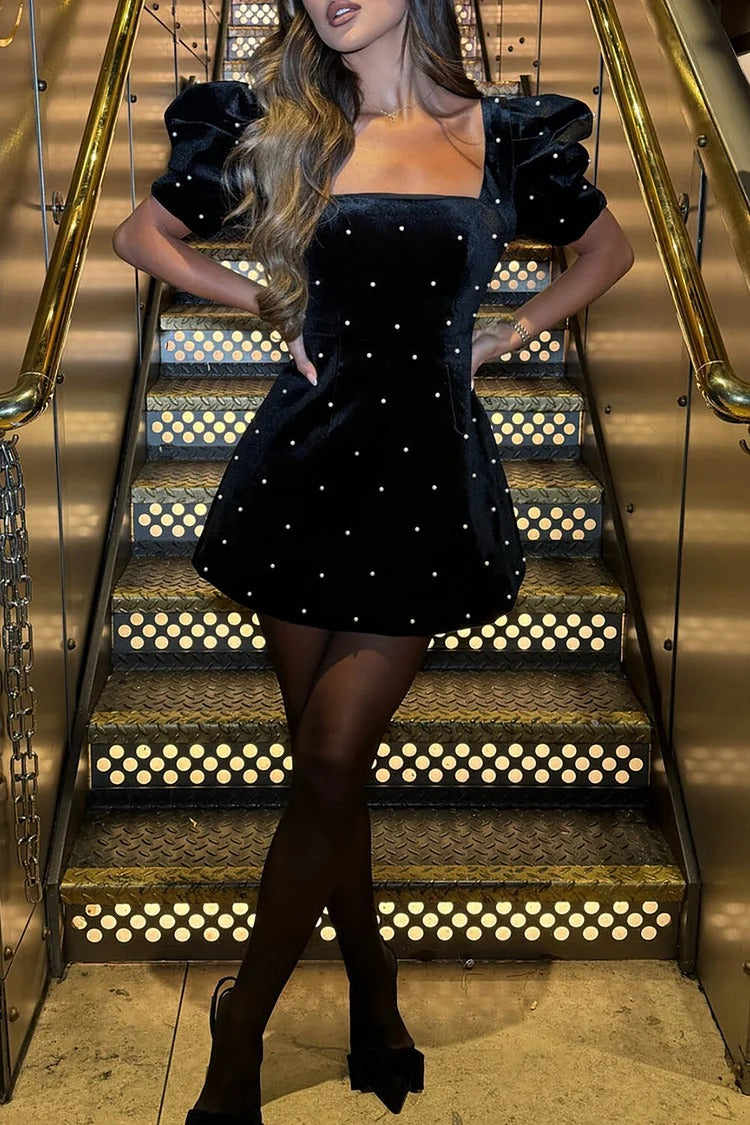 Joyce® | Puff Sleeve Square Neck Beaded Decor Velvet Mini Dresses - Black