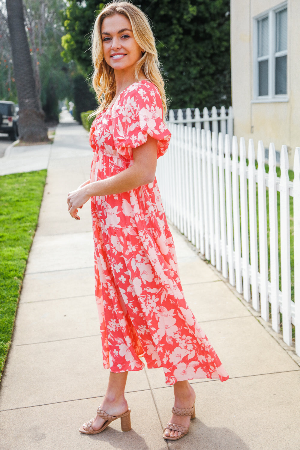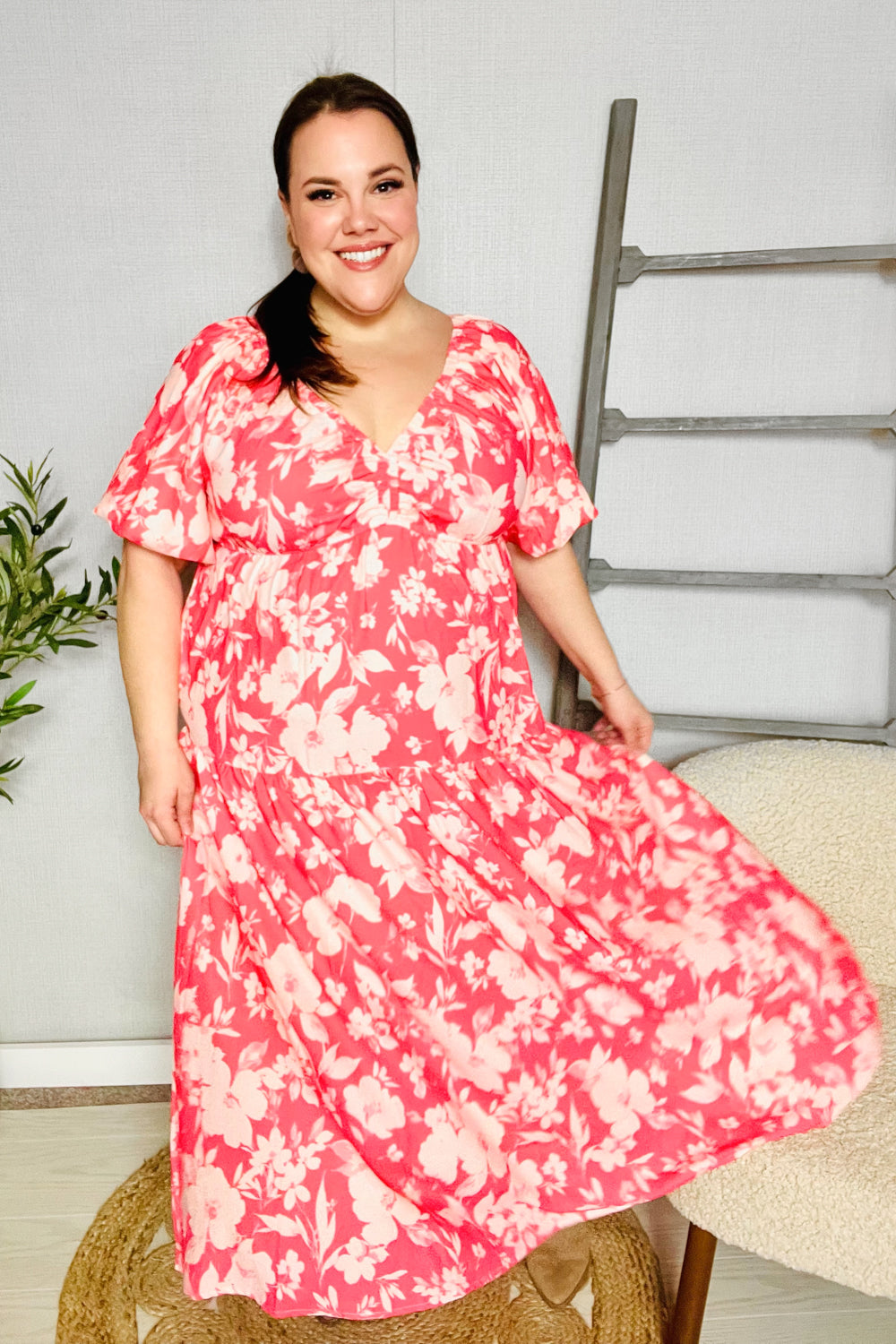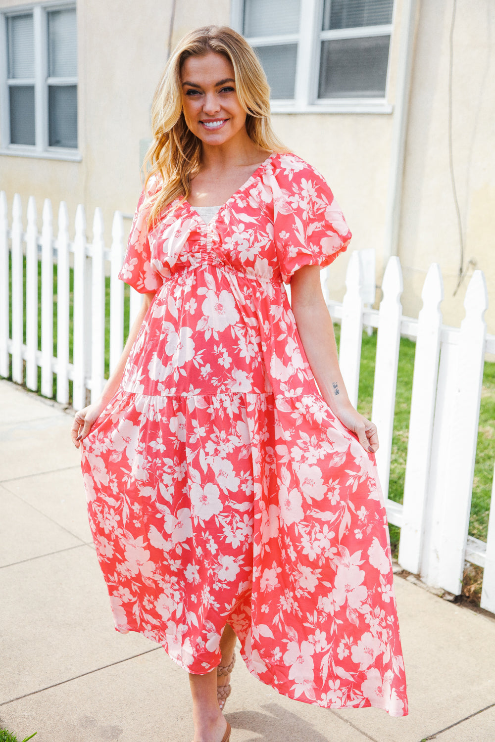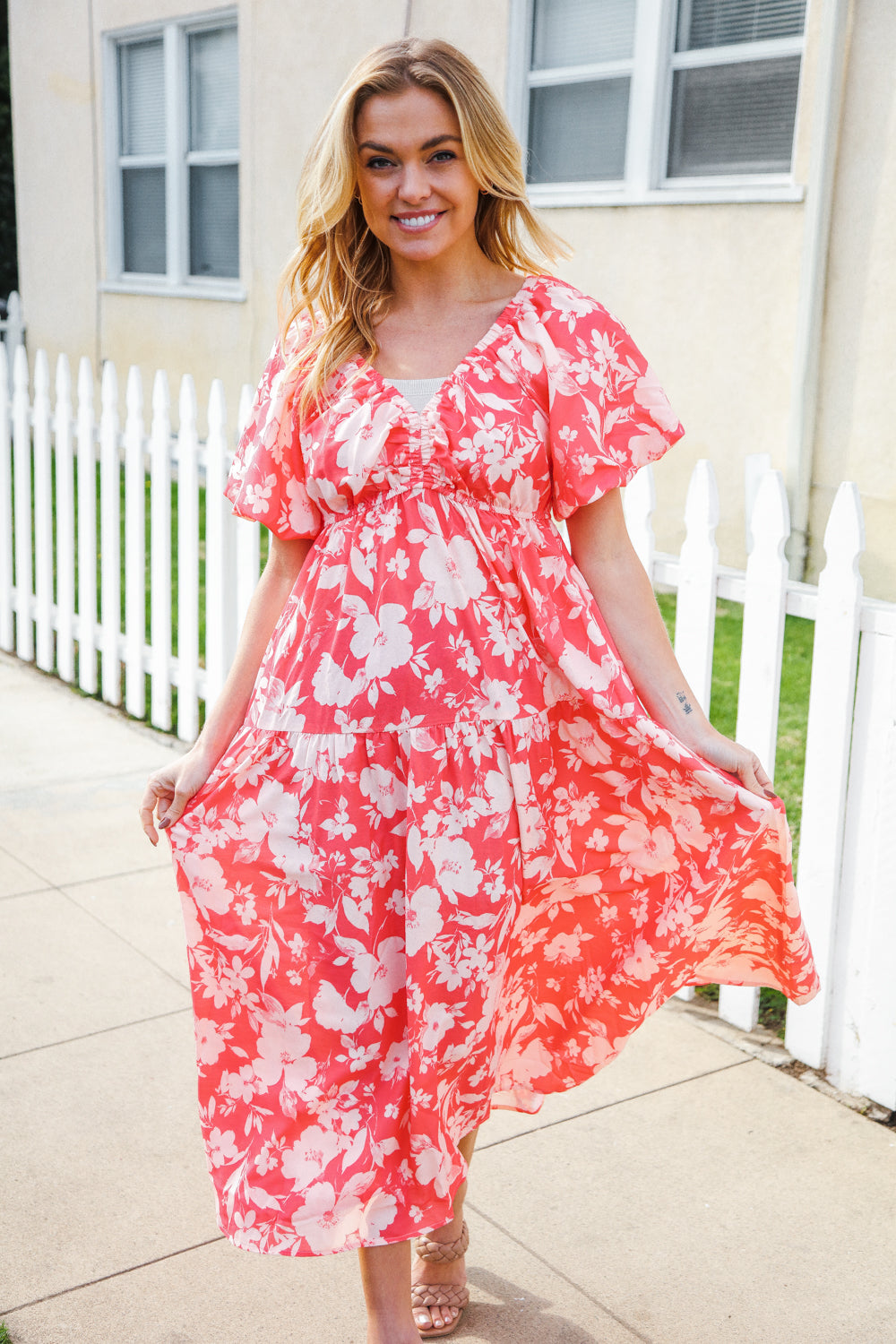 Bronte® | Elastic, tiered maxi dress with a large floral pattern and V-neck